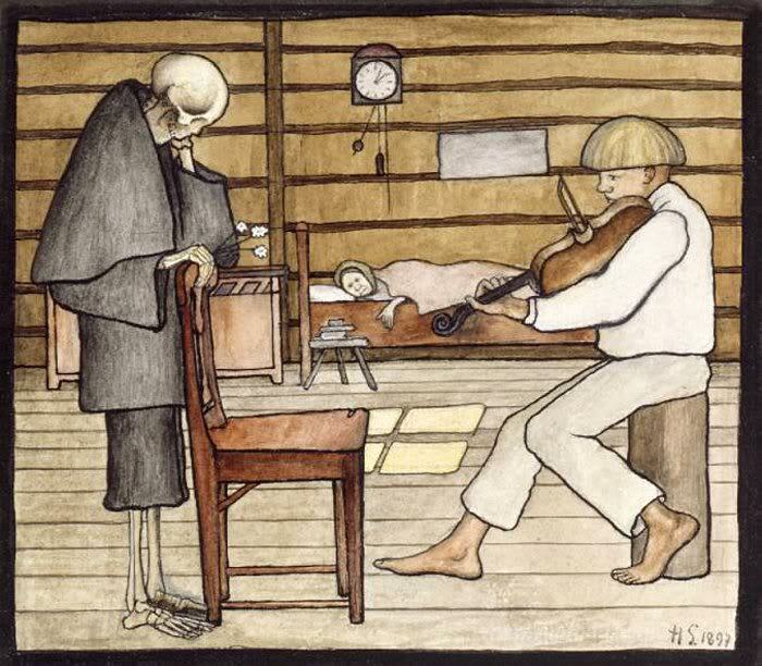Ti offriamo una riproduzione artigianale su tela dell'opera famosa 'Morte ascolti' di Hugo Simberg, dal Museo delle Riproduzioni.