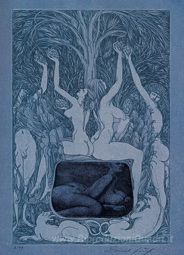 Ti offriamo una riproduzione artigianale su tela dell'opera famosa 'NEI FOGLI DI NOTTE' di Ernst Fuchs, dal Museo delle Riproduzioni.
