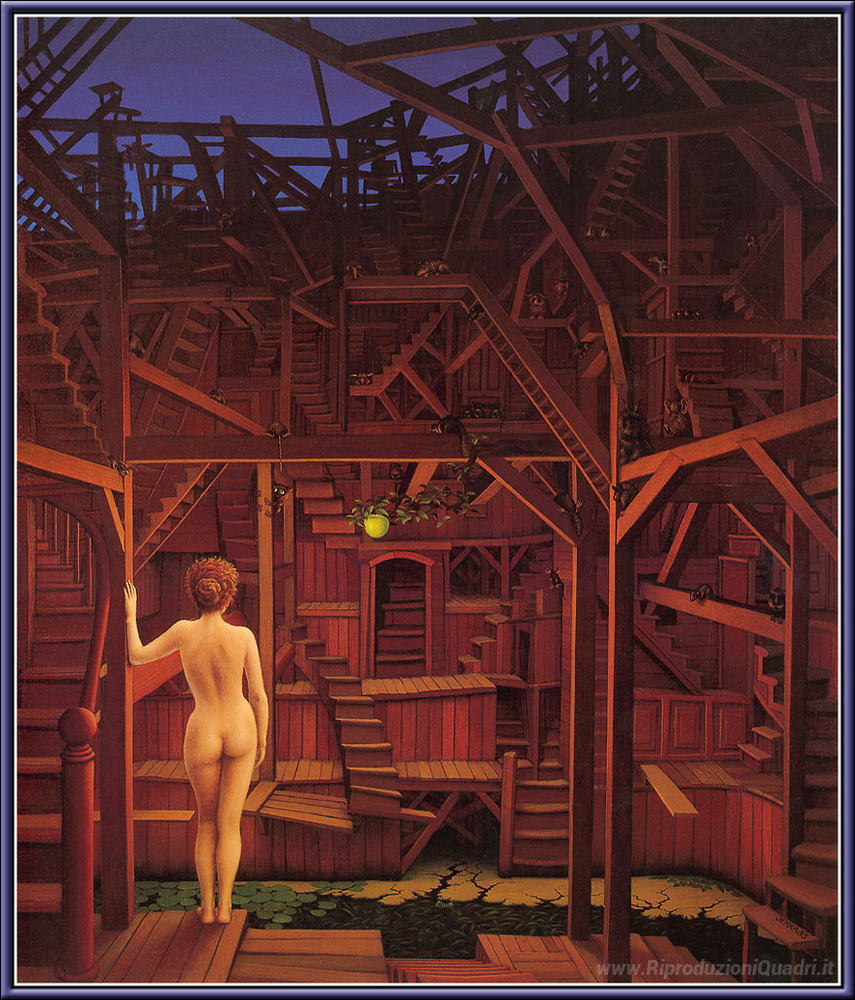 Ti offriamo una riproduzione artigianale su tela dell'opera famosa 'Nuoto Lezione' di Jacek Yerka, dal Museo delle Riproduzioni.