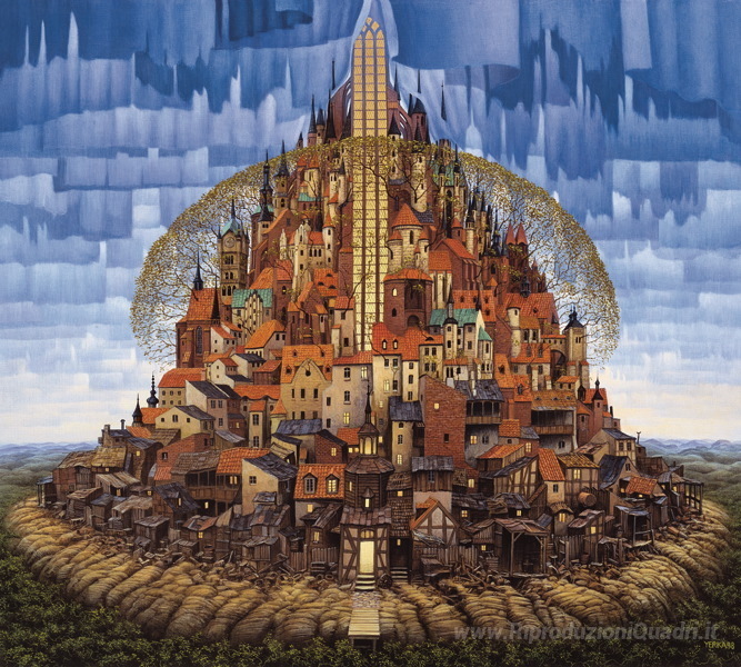 Ti offriamo una riproduzione artigianale su tela dell'opera famosa 'Primavera in Parrocchia' di Jacek Yerka, dal Museo delle Riproduzioni.