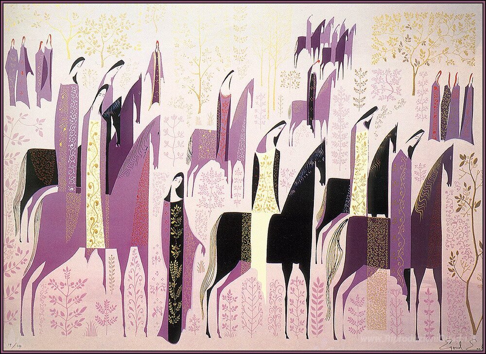 Ti offriamo una riproduzione artigianale su tela dell'opera famosa 'Promenade Medievale' di Eyvind Earle, dal Museo delle Riproduzioni.