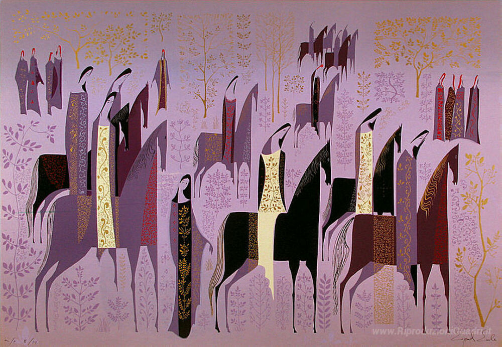 Ti offriamo una riproduzione artigianale su tela dell'opera famosa 'Promenade Medievale' di Eyvind Earle, dal Museo delle Riproduzioni.