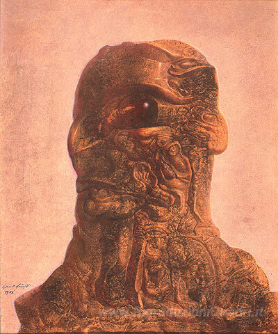 Ti offriamo una riproduzione artigianale su tela dell'opera famosa 'Putto con L'OCCHIO HEMATITE' di Ernst Fuchs, dal Museo delle Riproduzioni.