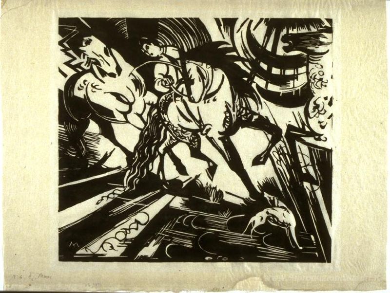 Ti offriamo una riproduzione artigianale su tela dell'opera famosa 'Scuola di Equitazione' di Franz Marc, dal Museo delle Riproduzioni.