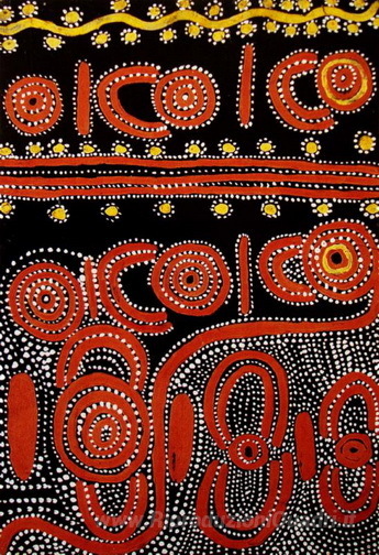 Ti offriamo una riproduzione artigianale su tela dell'opera famosa 'Selvaggio arancione Story' di Johnny Warangkula Tjupurrula, dal Museo delle Riproduzioni.