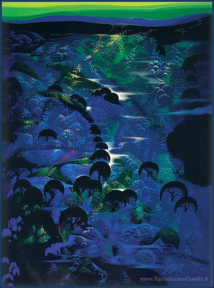 Ti offriamo una riproduzione artigianale su tela dell'opera famosa 'Sotto un cielo di smeraldo' di Eyvind Earle, dal Museo delle Riproduzioni.