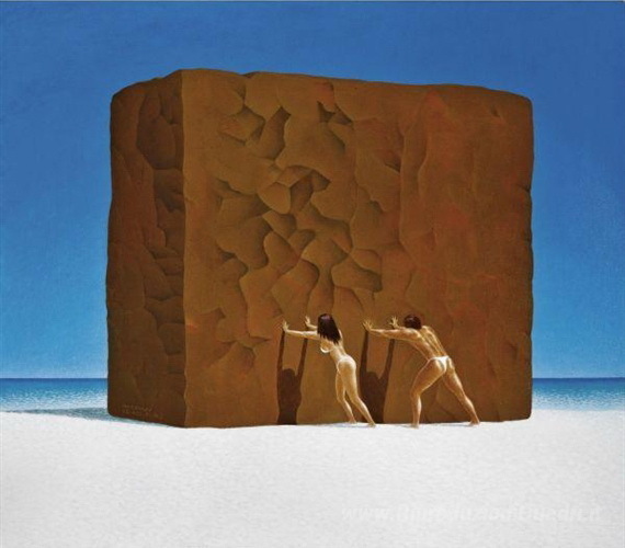 Ti offriamo una riproduzione artigianale su tela dell'opera famosa 'spingere' di Nyoman Masriadi, dal Museo delle Riproduzioni.