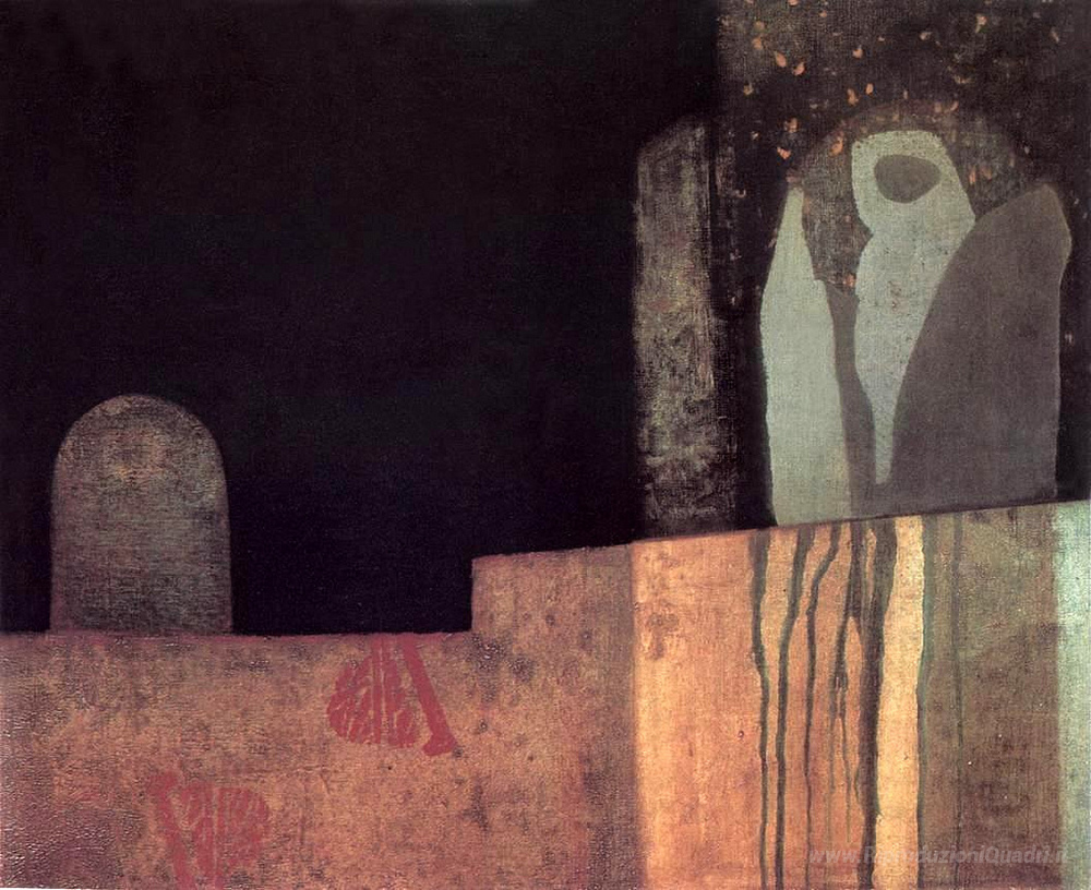 Ti offriamo una riproduzione artigianale su tela dell'opera famosa 'Statua in un cimitero' di Endre Balint, dal Museo delle Riproduzioni.