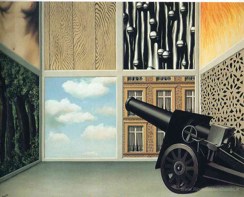 Ti offriamo una riproduzione artigianale su tela dell'opera famosa 'Sulla soglia della libertà' di Rene Magritte, dal Museo delle Riproduzioni.