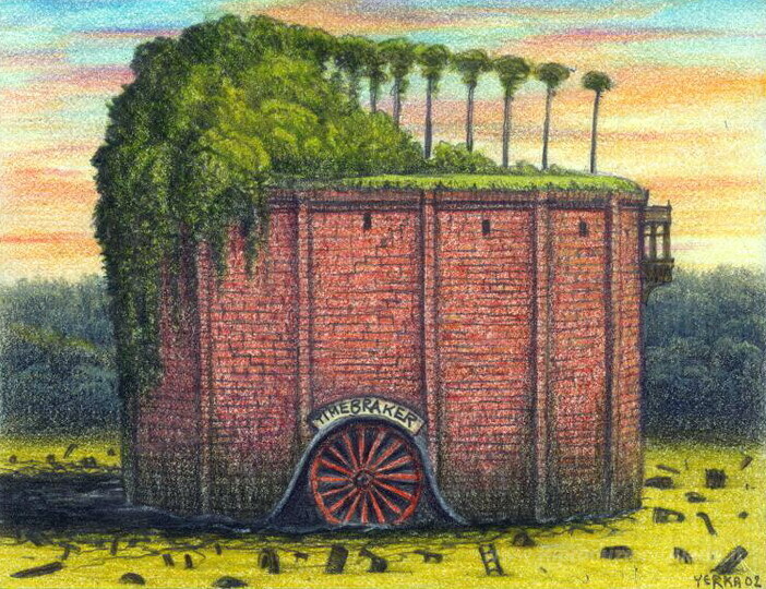 Ti offriamo una riproduzione artigianale su tela dell'opera famosa 'Timebreaker' di Jacek Yerka, dal Museo delle Riproduzioni.