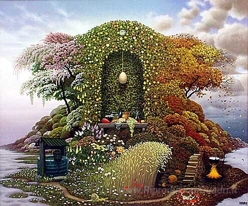 Ti offriamo una riproduzione artigianale su tela dell'opera famosa 'Tre Stagioni' di Jacek Yerka, dal Museo delle Riproduzioni.