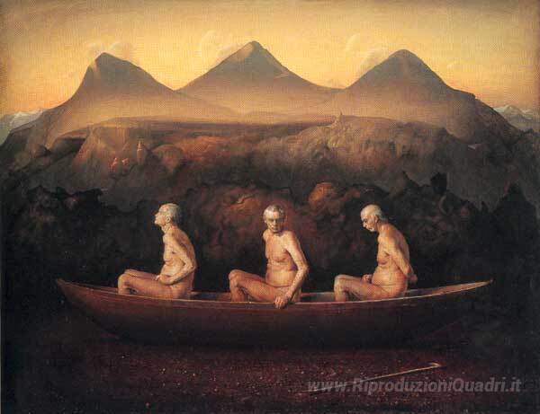Ti offriamo una riproduzione artigianale su tela dell'opera famosa 'Tre Uomini at Dawn' di Odd Nerdrum, dal Museo delle Riproduzioni.
