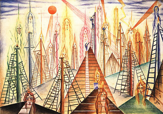 Benvenuti nel nostro selezionato catalogo di Trece San Mástiles, un'opera straordinaria dell'artista argentino Xul Solar. Nato nel 1887, Solar è un maestro della sintesi tra il simbolismo e il surrealismo, capace di trasportare l'osservatore in un mondo onirico e astratto, dove la realtà e la fantasia si intrecciano armoniosamente. I suoi dipinti, caratterizzati da una vivace palette di colori e forme geometriche, raccontano storie che sfidano il tempo e lo spazio.