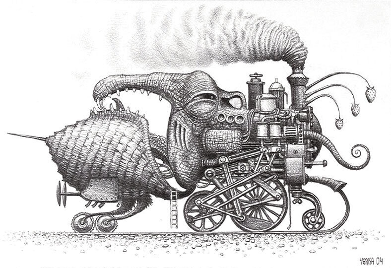 Ti offriamo una riproduzione artigianale su tela dell'opera famosa 'Treno a scartamento ridotto' di Jacek Yerka, dal Museo delle Riproduzioni.