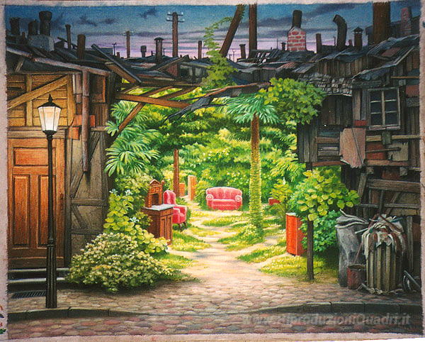 Ti offriamo una riproduzione artigianale su tela dell'opera famosa 'Ultimo minuto' di Jacek Yerka, dal Museo delle Riproduzioni.