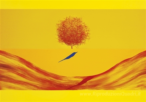 Ti offriamo una riproduzione artigianale su tela dell'opera famosa 'Untitled (Uccello, Albero e Montagna)' di Jagdish Swaminathan, dal Museo delle Riproduzioni.