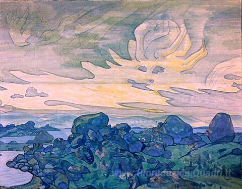 Ti offriamo una riproduzione artigianale su tela dell'opera famosa 'Via dei giganti' di Nicholas Roerich, dal Museo delle Riproduzioni.
