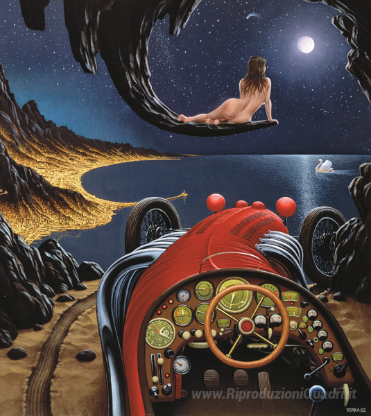 Ti offriamo una riproduzione artigianale su tela dell'opera famosa 'Visione sul Golfo di Genova' di Jacek Yerka, dal Museo delle Riproduzioni.