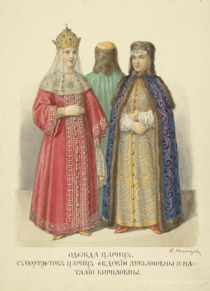Ti offriamo una riproduzione artigianale su tela dell'opera famosa 'Abbigliamento di regine. Con i ritratti delle regine Evdokia Luk' di Fyodor Solntsev, dal Museo delle Riproduzioni.