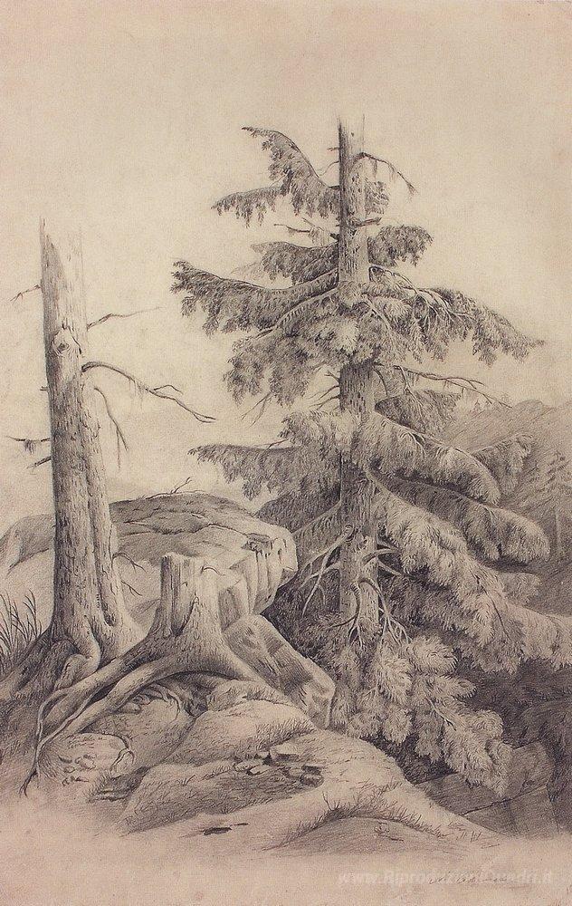 Ti offriamo una riproduzione artigianale su tela dell'opera famosa 'Abete rosso' di Aleksey Savrasov, dal Museo delle Riproduzioni.