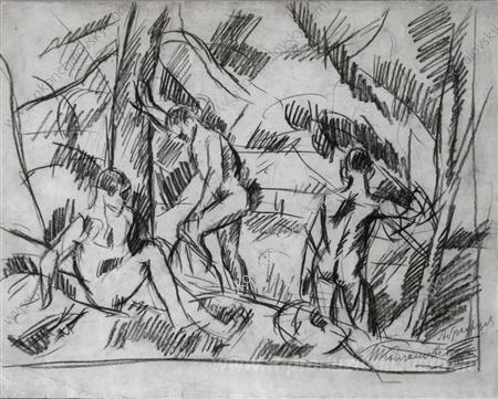 Ti offriamo una riproduzione artigianale su tela dell'opera famosa 'Abramtsevo. I ragazzi al fiume. Disegno per il dipinto 'Ragazzi ' di Pyotr Konchalovsky, dal Museo delle Riproduzioni.