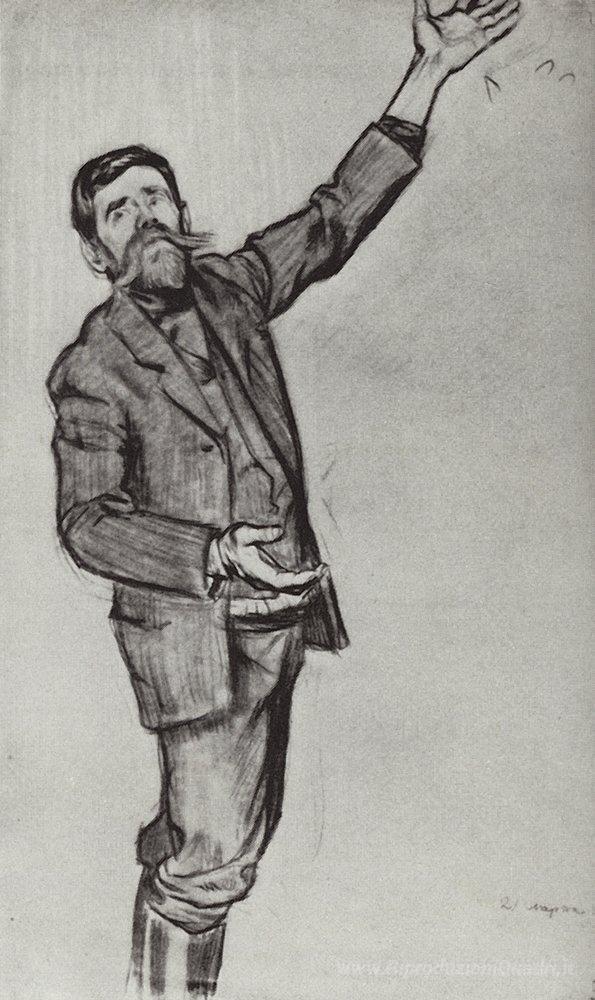 Ti offriamo una riproduzione artigianale su tela dell'opera famosa 'Agitator (L'uomo con il braccio alzato)' di Boris Kustodiev, dal Museo delle Riproduzioni.