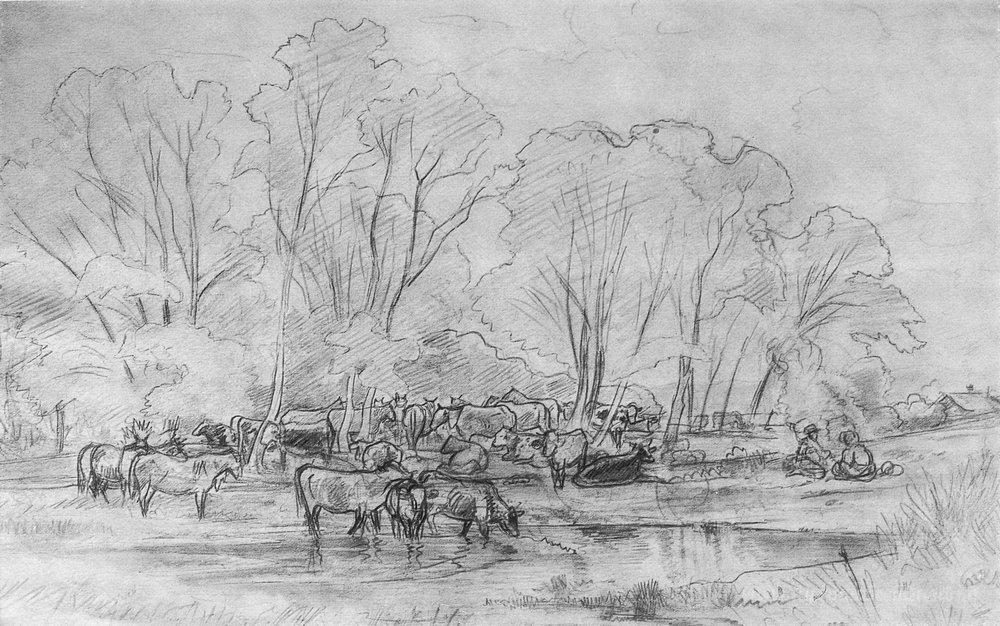 Ti offriamo una riproduzione artigianale su tela dell'opera famosa 'Allevamento vicino a un corso d'acqua' di Ivan Shishkin, dal Museo delle Riproduzioni.