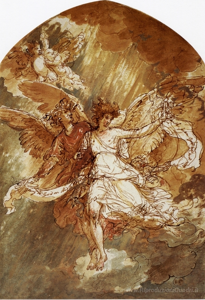 Ti offriamo una riproduzione artigianale su tela dell'opera famosa 'Angeli Annunciando la nascita del nostro Salvatore' di Benjamin West, dal Museo delle Riproduzioni.