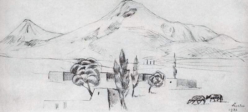 Ti offriamo una riproduzione artigianale su tela dell'opera famosa 'Ararat' di Martiros Saryan, dal Museo delle Riproduzioni.