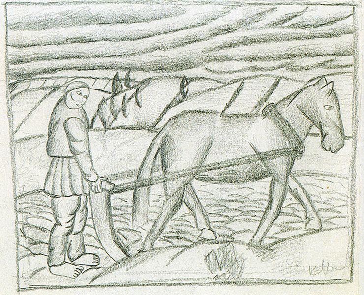 Ti offriamo una riproduzione artigianale su tela dell'opera famosa 'Aratore' di Kazimir Malevich, dal Museo delle Riproduzioni.