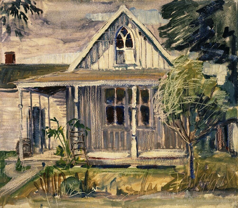 Ti offriamo una riproduzione artigianale su tela dell'opera famosa 'Bozzetto per casa a American Gothic' di Grant Wood, dal Museo delle Riproduzioni.