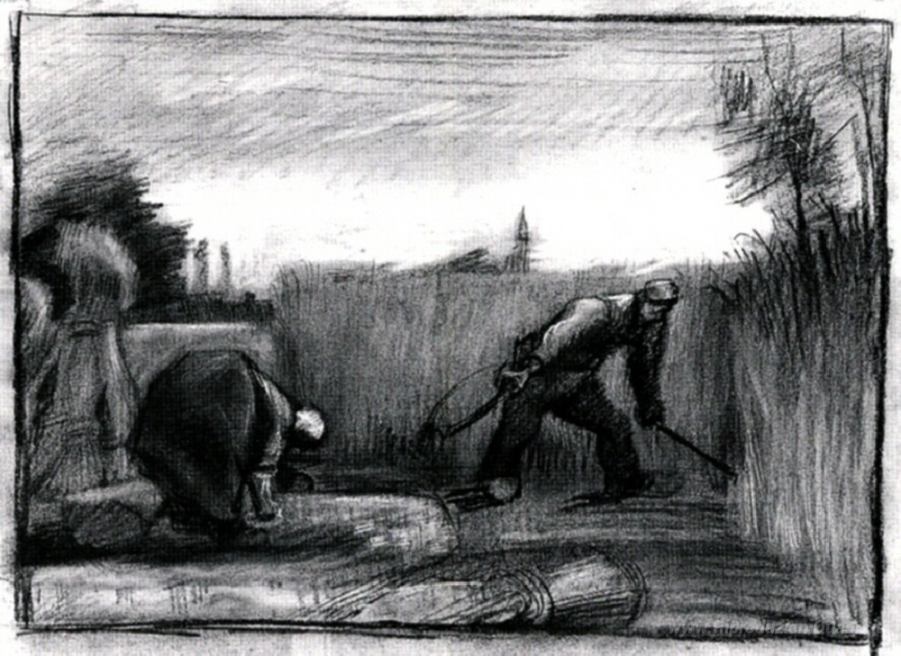 Ti offriamo una riproduzione artigianale su tela dell'opera famosa 'Campo di grano con Mower e curvo Contadina' di Vincent van Gogh, dal Museo delle Riproduzioni.