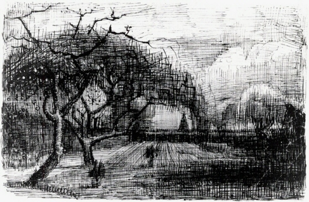 Ti offriamo una riproduzione artigianale su tela dell'opera famosa 'Canonica con fioritura alberi' di Vincent van Gogh, dal Museo delle Riproduzioni.