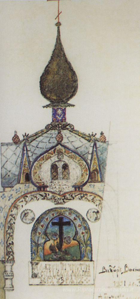 Ti offriamo una riproduzione artigianale su tela dell'opera famosa 'Cappella sulla tomba di Alessandro Mamontov a Abramtsevo' di Viktor Vasnetsov, dal Museo delle Riproduzioni.