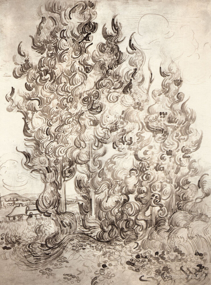 Ti offriamo una riproduzione artigianale su tela dell'opera famosa 'Cipressi' di Vincent van Gogh, dal Museo delle Riproduzioni.