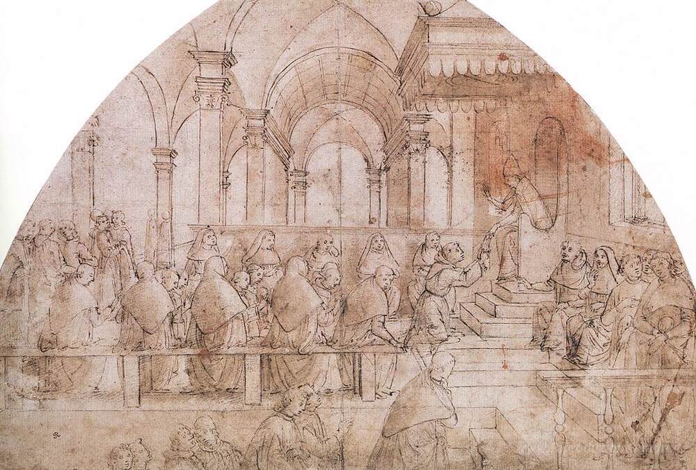 Ti offriamo una riproduzione artigianale su tela dell'opera famosa 'Conferma della Regola' di Domenico Ghirlandaio, dal Museo delle Riproduzioni.