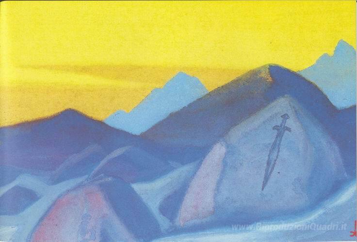 Ti offriamo una riproduzione artigianale su tela dell'opera famosa 'Confine di spada (studio)' di Nicholas Roerich, dal Museo delle Riproduzioni.