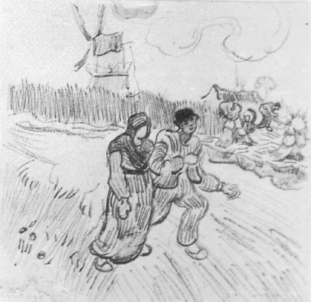 Ti offriamo una riproduzione artigianale su tela dell'opera famosa 'Coppia a braccetto e altre figure, con un mulino a vento in back' di Vincent van Gogh, dal Museo delle Riproduzioni.