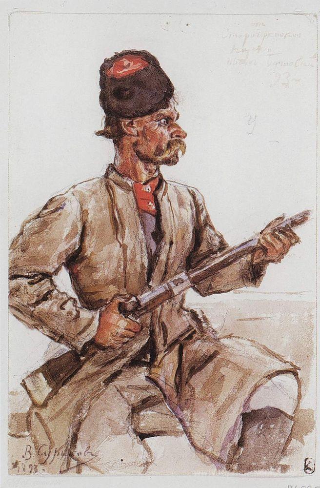 Ti offriamo una riproduzione artigianale su tela dell'opera famosa 'Cossack con la pistola' di Vasily Surikov, dal Museo delle Riproduzioni.