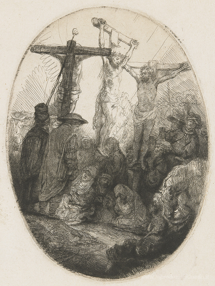 Ti offriamo una riproduzione artigianale su tela dell'opera famosa 'Cristo crocifisso tra i due ladroni un piatto ovale' di Rembrandt, dal Museo delle Riproduzioni.