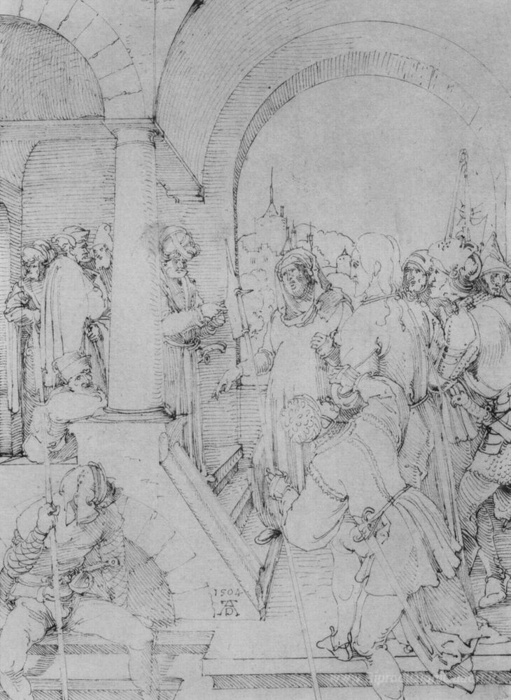 Ti offriamo una riproduzione artigianale su tela dell'opera famosa 'Cristo davanti a Pilato' di Albrecht Durer, dal Museo delle Riproduzioni.