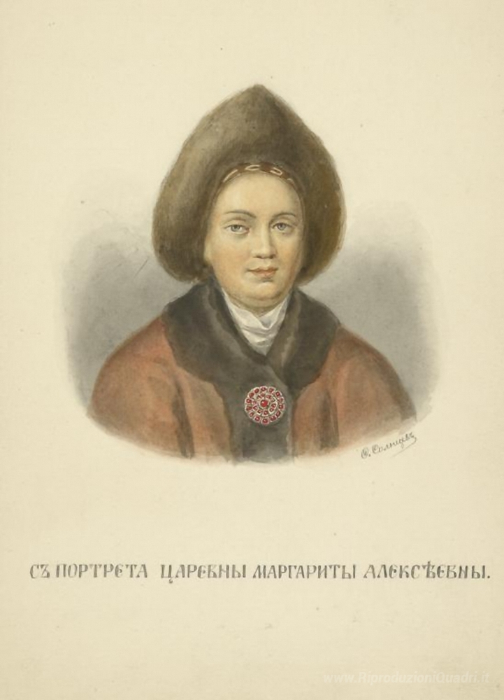 Ti offriamo una riproduzione artigianale su tela dell'opera famosa 'Dal ritratto di Margaret Alekseevny' di Fyodor Solntsev, dal Museo delle Riproduzioni.