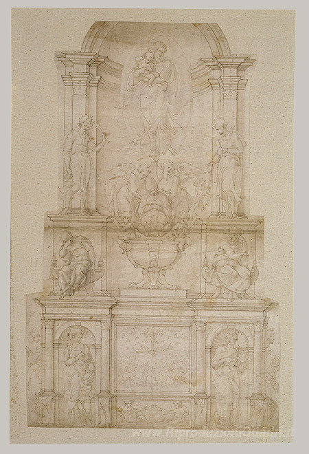 Ti offriamo una riproduzione artigianale su tela dell'opera famosa 'Design per Giulio II tomba (prima versione)' di Michelangelo, dal Museo delle Riproduzioni.