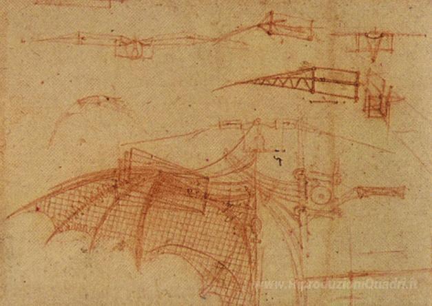 Ti offriamo una riproduzione artigianale su tela dell'opera famosa 'Design per una macchina volante' di Leonardo da Vinci, dal Museo delle Riproduzioni.