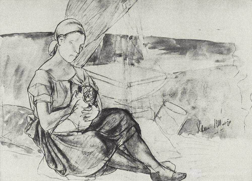 Ti offriamo una riproduzione artigianale su tela dell'opera famosa 'Disegnare per una foto di Madre' di Kuzma Petrov-Vodkin, dal Museo delle Riproduzioni.