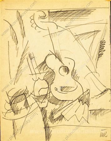 Ti offriamo una riproduzione artigianale su tela dell'opera famosa 'Disegnare una natura morta con la chitarra' di Pyotr Konchalovsky, dal Museo delle Riproduzioni.
