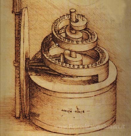 Ti offriamo una riproduzione artigianale su tela dell'opera famosa 'Dispositivo a molla' di Leonardo da Vinci, dal Museo delle Riproduzioni.
