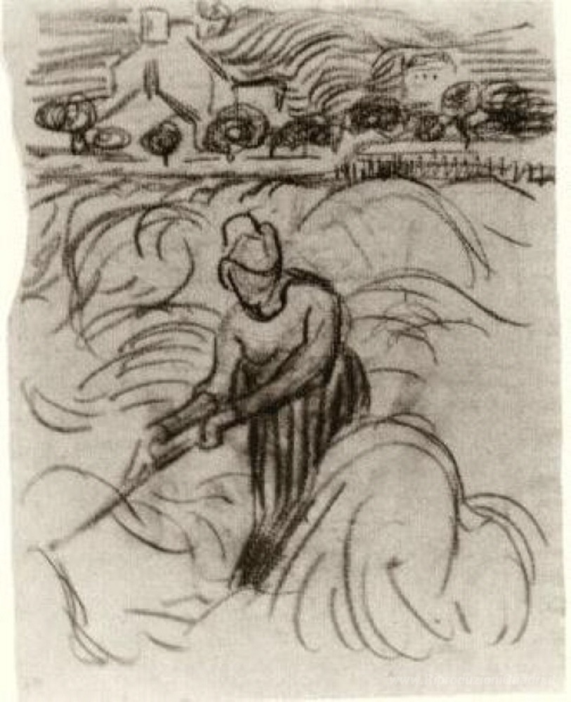 Ti offriamo una riproduzione artigianale su tela dell'opera famosa 'Donna che lavora in campo di grano' di Vincent van Gogh, dal Museo delle Riproduzioni.