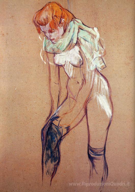 Ti offriamo una riproduzione artigianale su tela dell'opera famosa 'Donna che mette sul suo Stocking' di Henri de Toulouse-Lautrec, dal Museo delle Riproduzioni.
