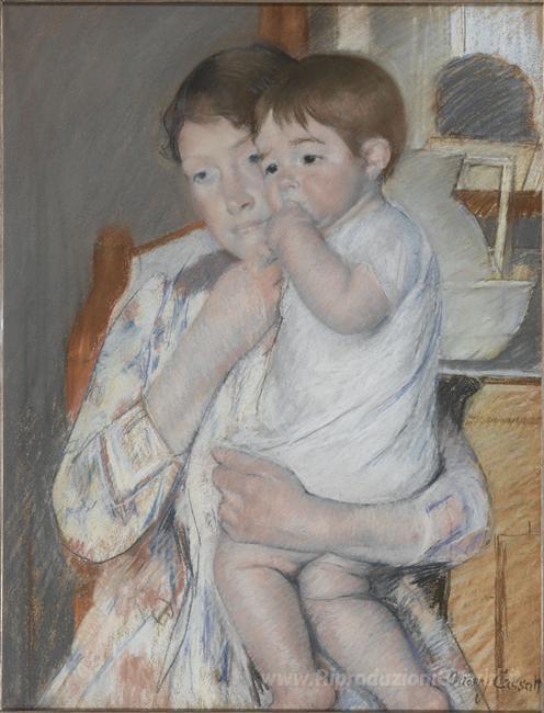 Ti offriamo una riproduzione artigianale su tela dell'opera famosa 'Donna e bambino di fronte a uno scaffale che sono posti una broc' di Mary Cassatt, dal Museo delle Riproduzioni.